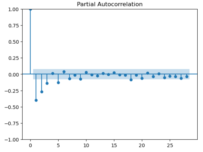PACF ๋ํ์์ ํ๋์ ์์ ์์ ๋ค์ด์ค๋ ์์ฐจ(์ ๋จ์ ) - 1์ p๋ก ์ค์ ํ๋ค.